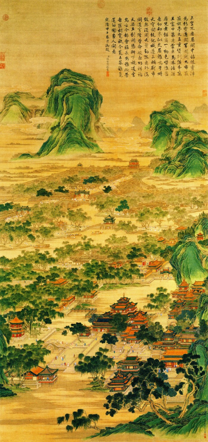 Court painters made new versions of the Song Dynasty masterpiece, Zhang Zeduan’s Along the River During the Qingming Festival whose depiction of a prosperous and happy realm demonstrated the beneficence of the emperor. The emperors undertook tours of the south and commissioned monumental scrolls to depict the grandeur of the occasion. Imperial patronage also encouraged the industrial production of ceramics and Chinese export porcelain.